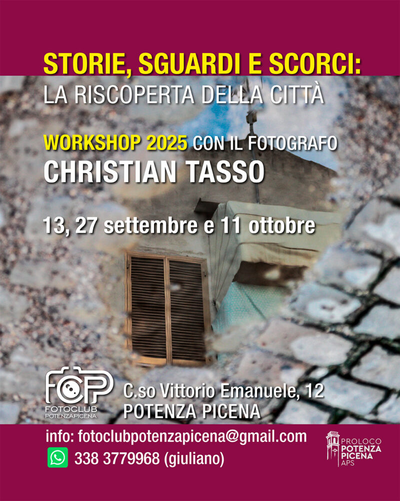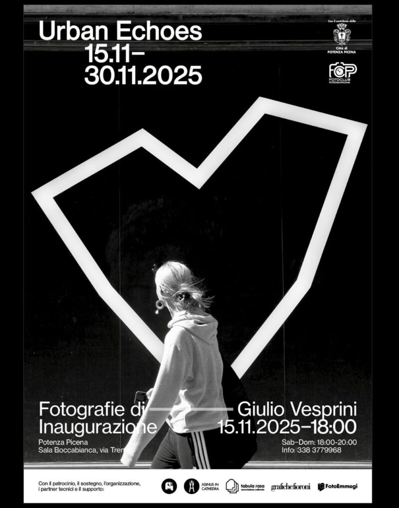 “Urban Echoes” dal 15 al 30 Novembre 2025. Sala Boccabianca Potenza Picena. Con orgoglio e piacere presentiamo la prima mostra fotografica di Giulio Vesprini, a cura del Fotoclub e Fototeca di Potenza Picena in collaborazione con Tabula Rasa Festival e Associazione culturale Tabula Rasa. Una tappa silenziosa del suo percorso artistico da Urban Artist, Art Director, Architetto, che si pone come anello di congiunzione tra le sue discipline. Scatti fotografici, sguardi, che raccontano gli hinc et nunc di diverse città […]