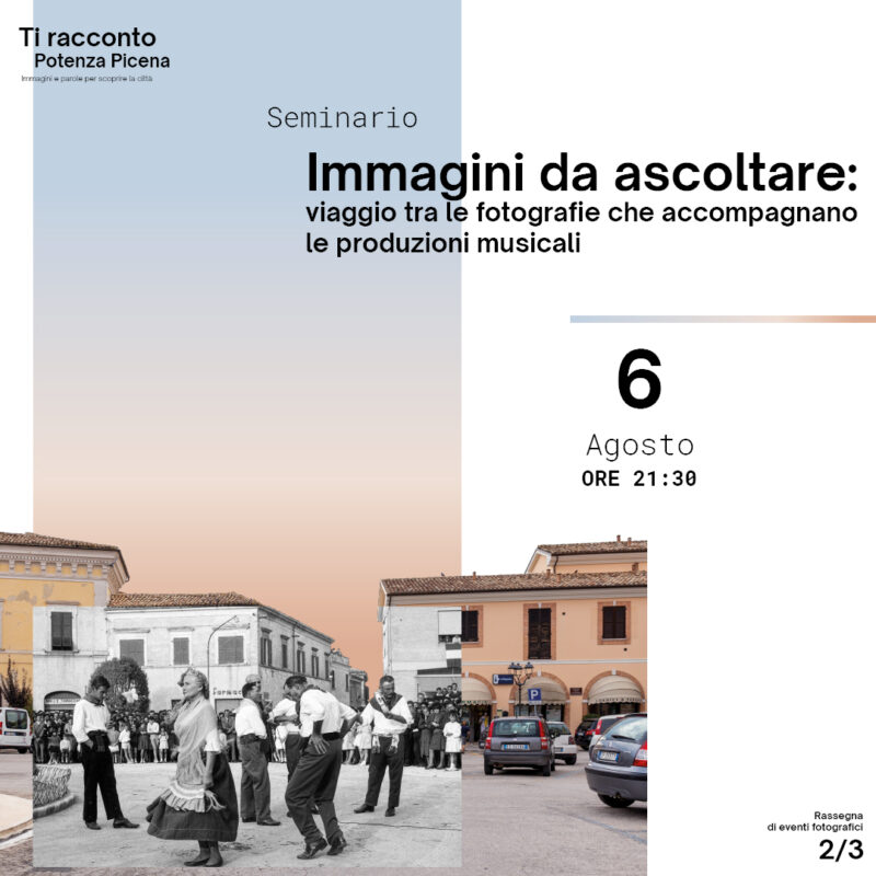 6 AGOSTO / 21:30 / GIARDINI DI VILLA BUONACCORSI IMMAGINI DA ASCOLTARE: viaggio tra le fotografie che accompagnano le produzioni musicali Uno degli eventi della rassegna “Ti racconto Potenza Picena” è dedicato al rapporto tra editoria musicale e fotografia. Le copertine dei vecchi vinili, così come quelle dei CD, non sono state e non sono semplici elementi di contorno, al contrario ricoprono un ruolo ben preciso all’interno della produzione musicale e della vita dell’artista. E con l’arrivo di Spotify e […]