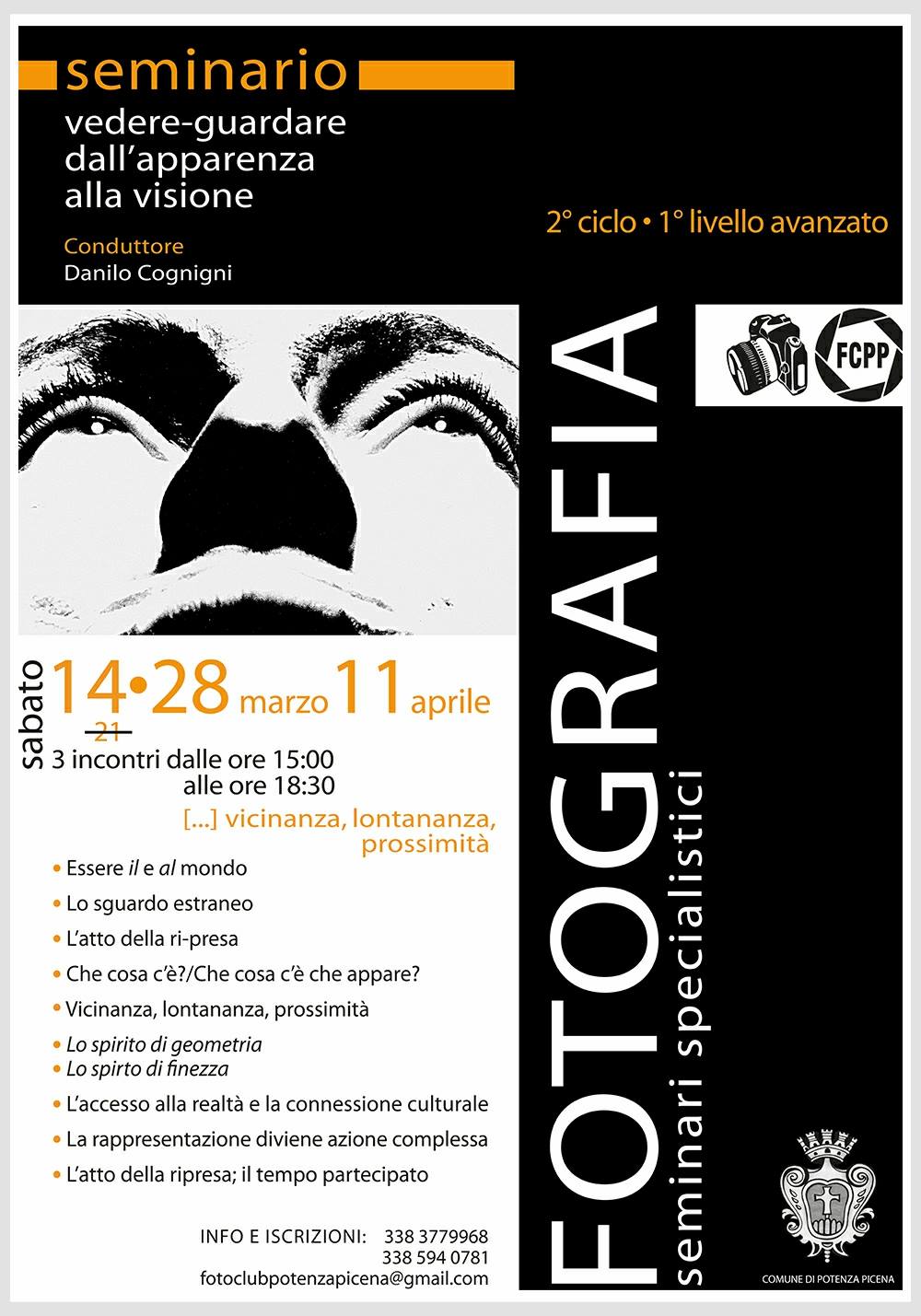 Vedere-guardare , dall’apparenza alla visione  Il Fotoclub di Potenza Picena organizza il 2′ seminario: “Vedere-guardare, dall’apparenza alla visione”, condotto da Danilo Cognigni, fotografo e semiologo dei linguaggi visuali. Il 2° ciclo – 1° livello avanzato si terrĂ il 14 – 28 Marzo e 11 Aprile dalle ore 15,00 alle ore 18,30 sempre nei locali del fotoclub. Chi fosse interessato, può scaricare qui la scheda di iscrizione al seminario, mentre per i partecipanti al primo seminario, è sufficiente inviare […]